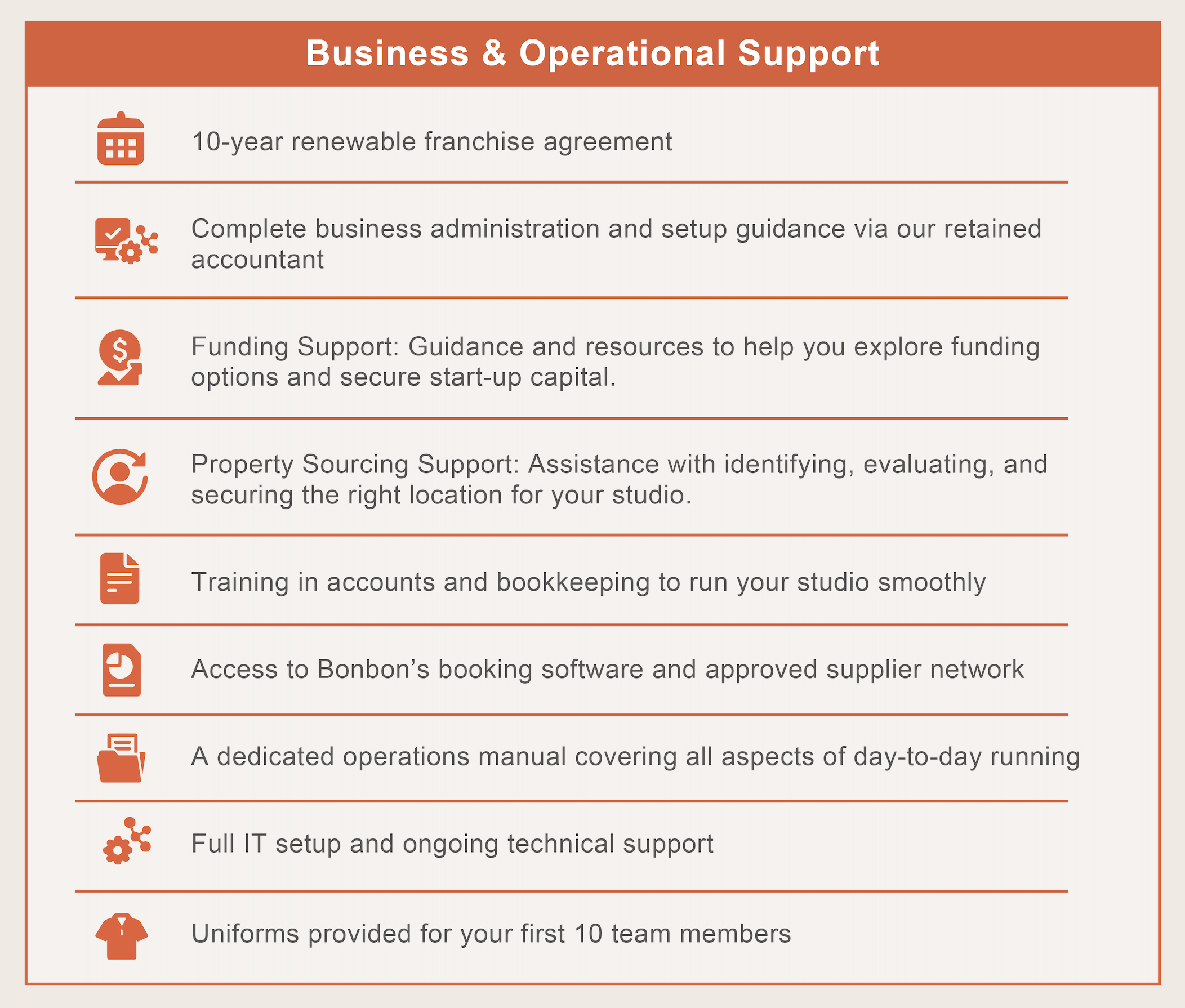 Opening a Bonbon studio typically requires an investment of £268,000+. This includes the franchise fee, fit-out, equipment, initial stock, and working capital.